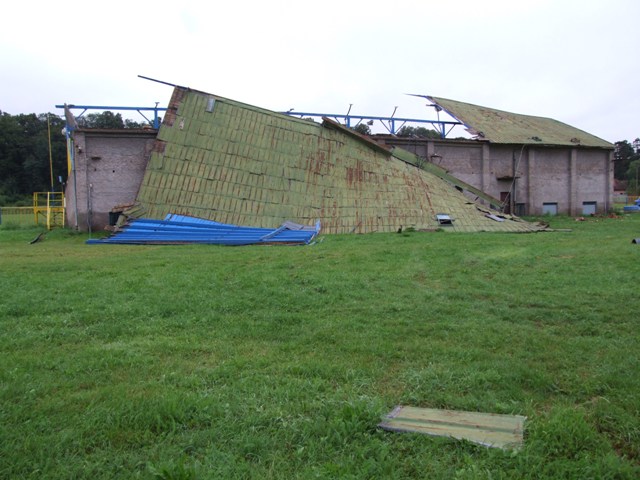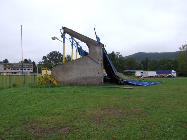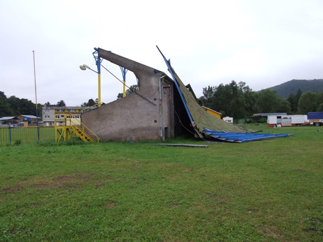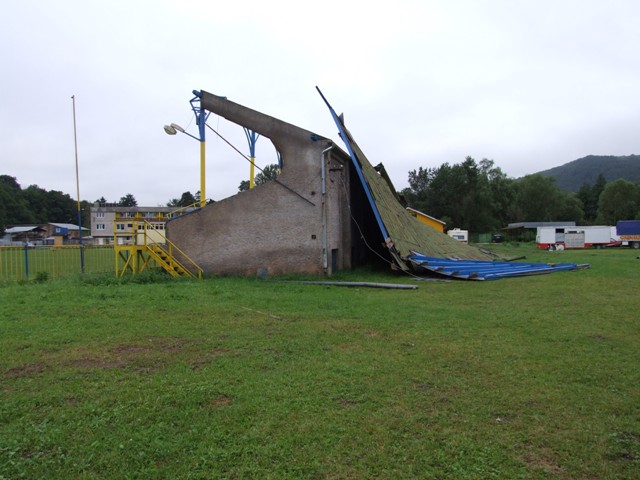 Rožňavský futbalový štadión prišiel počas pondelkovej silnej búrky o strechu nad hlavnou tribúnou.