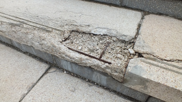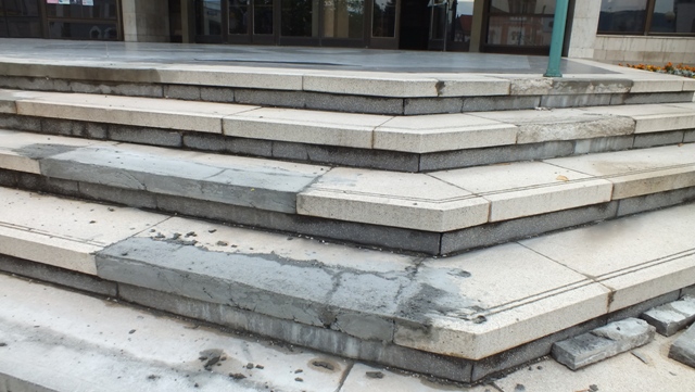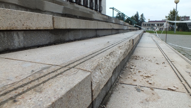 Ako ďalej uviedol, materiál, použitý na výstavbu schodiska bol podľa neho volený nevhodne, pretože duté armované betónové prefabrikáty v imitácii prírodného lomového travertínu, ako aj sivá dlažba, ktorá má početné praskliny, naznačujú ich nevhodnosť do mrznúceho prostredia.