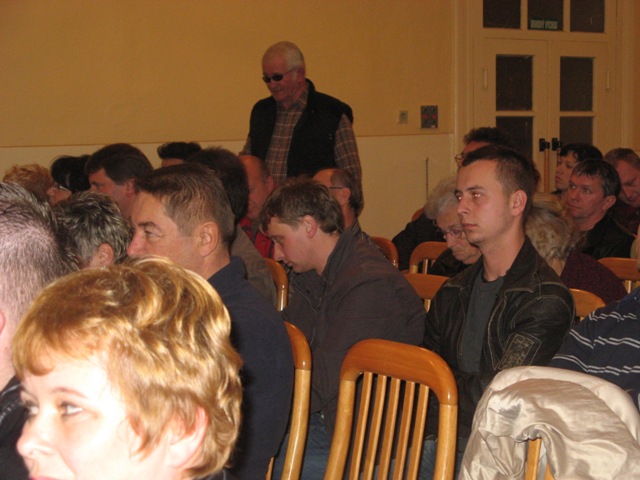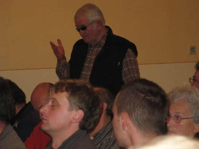 Štefan Szarka, starosta obce, opätovný kandidát na tento post, v diskusii na mítingu
