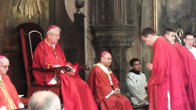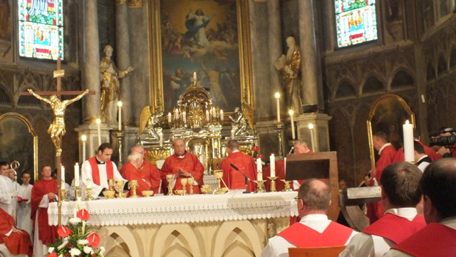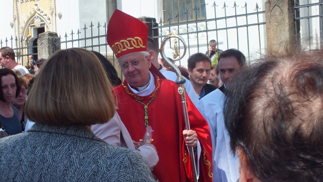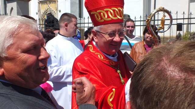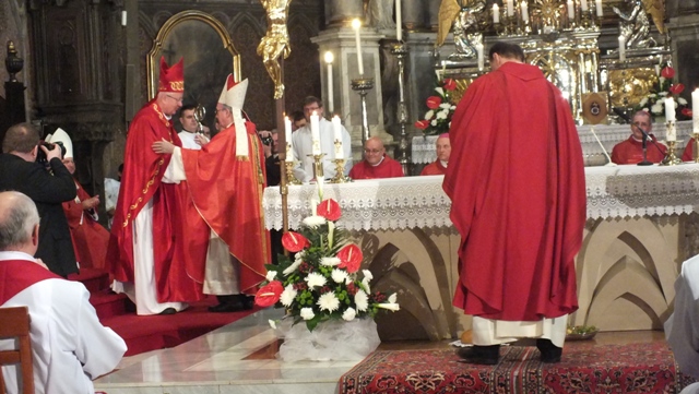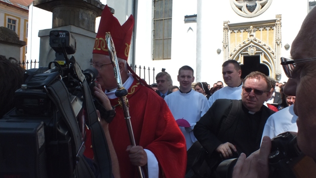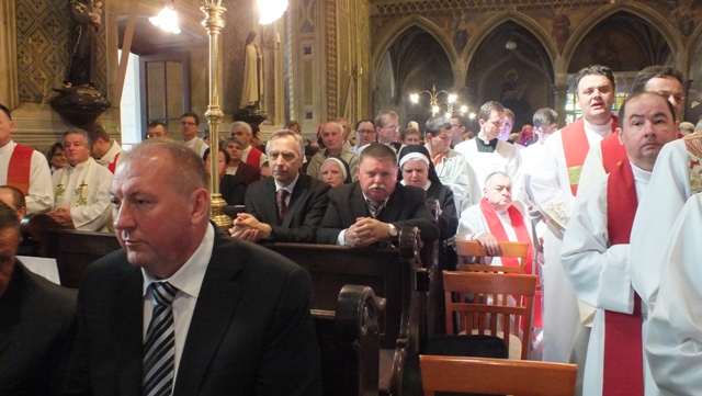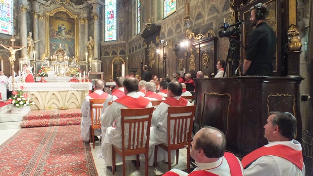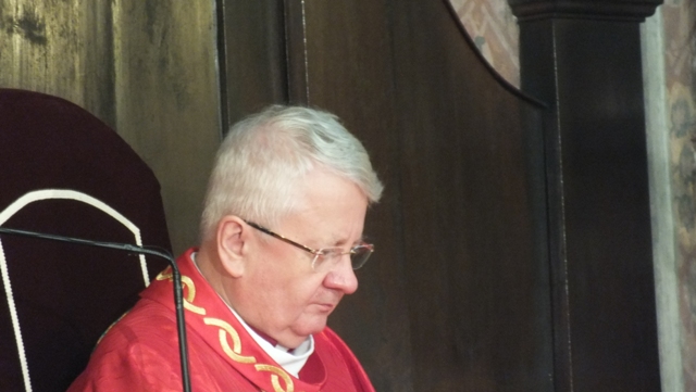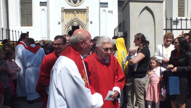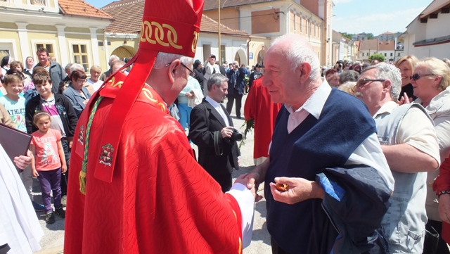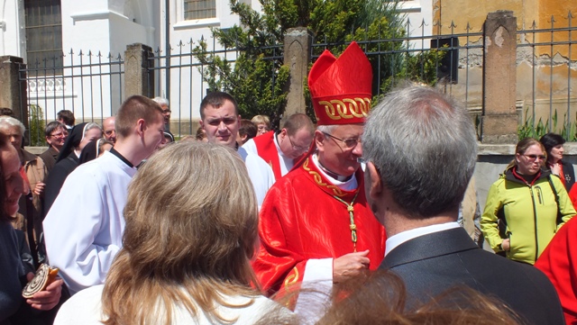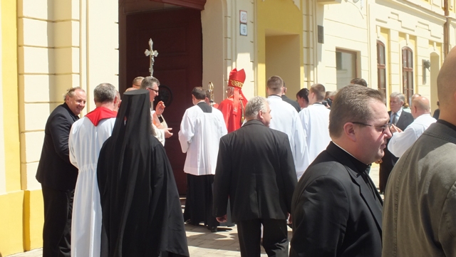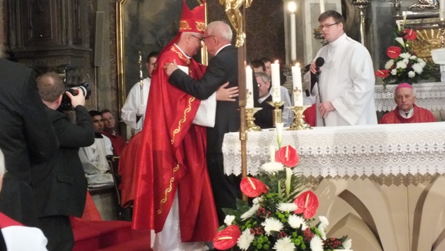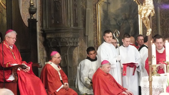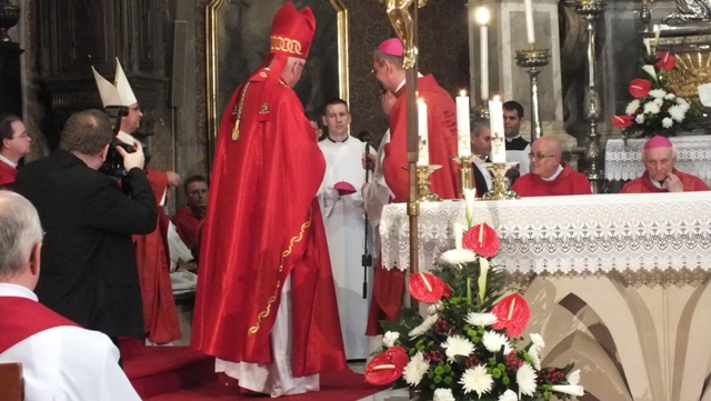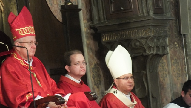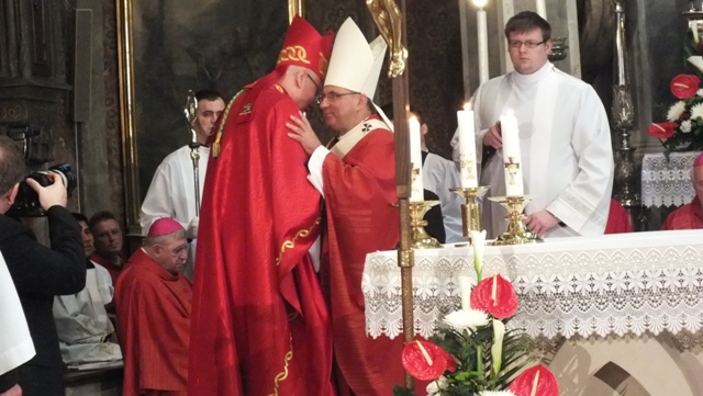 Mons. Stanislav Stolárik, rodák z Rožňavy, kde sa narodil a bol pokrstený, prebral úrad diecézneho rožňavského biskupa po Mons. Vladimírovi Filovi, ktorý počas dnešnej slávnosti v katedrále sedel v jeho blízkosti.