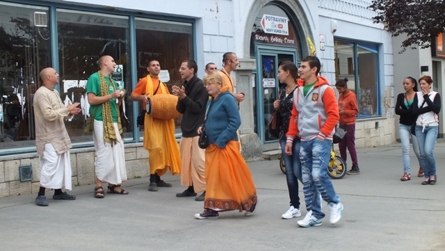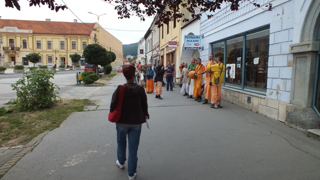 DSCF5644„To, čo robíme, to je vlastne sprievod, spievanie svätého mena Boha, pochádza to zo starej Indie,“ vysvetlil nám mladý muž, pôvodom z Martina. „Spievame mantru, ktorá očisťuje naše srdce, môžme pochopiť, že sme veční.“